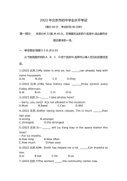 2022年北京市初中学业水平考试(满分:60分 考试时间:90分钟)第一部分 本部分共33题,共40分。在每题列出的四个选项中,选出最符合题目要求的一项。 一、单项填空(每题0.5分,共6分)从下面各题所给的A、B、C、D四个选项中,选择可以填入空白处的最佳选项。1.(2022北京,1)Mysisterisonlysix,but canalreadyhelpwithsomehousework. A.he B.she C.it D.they2.(2022北京,2)Wehavehistoryclass threeoclockeveryF...