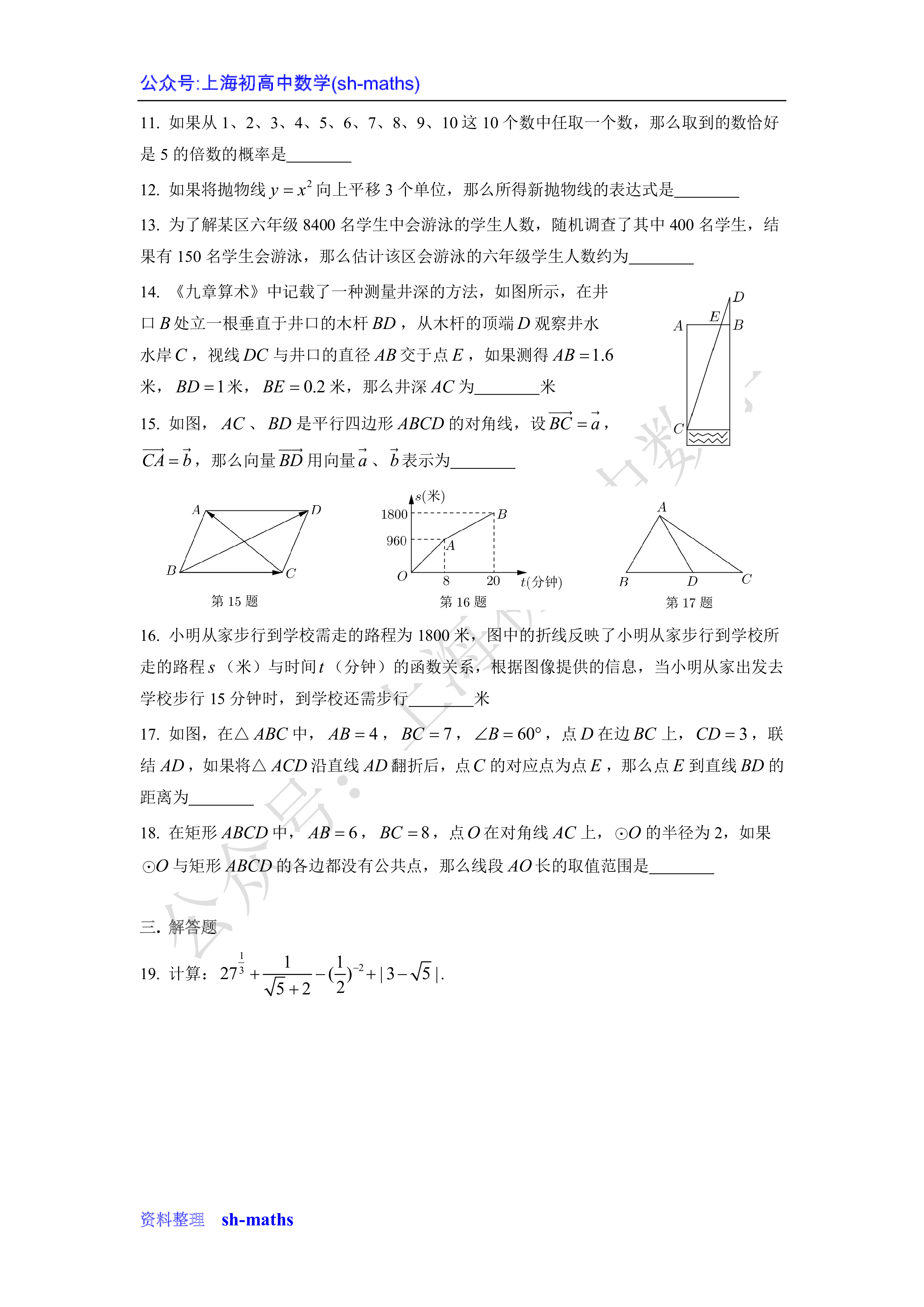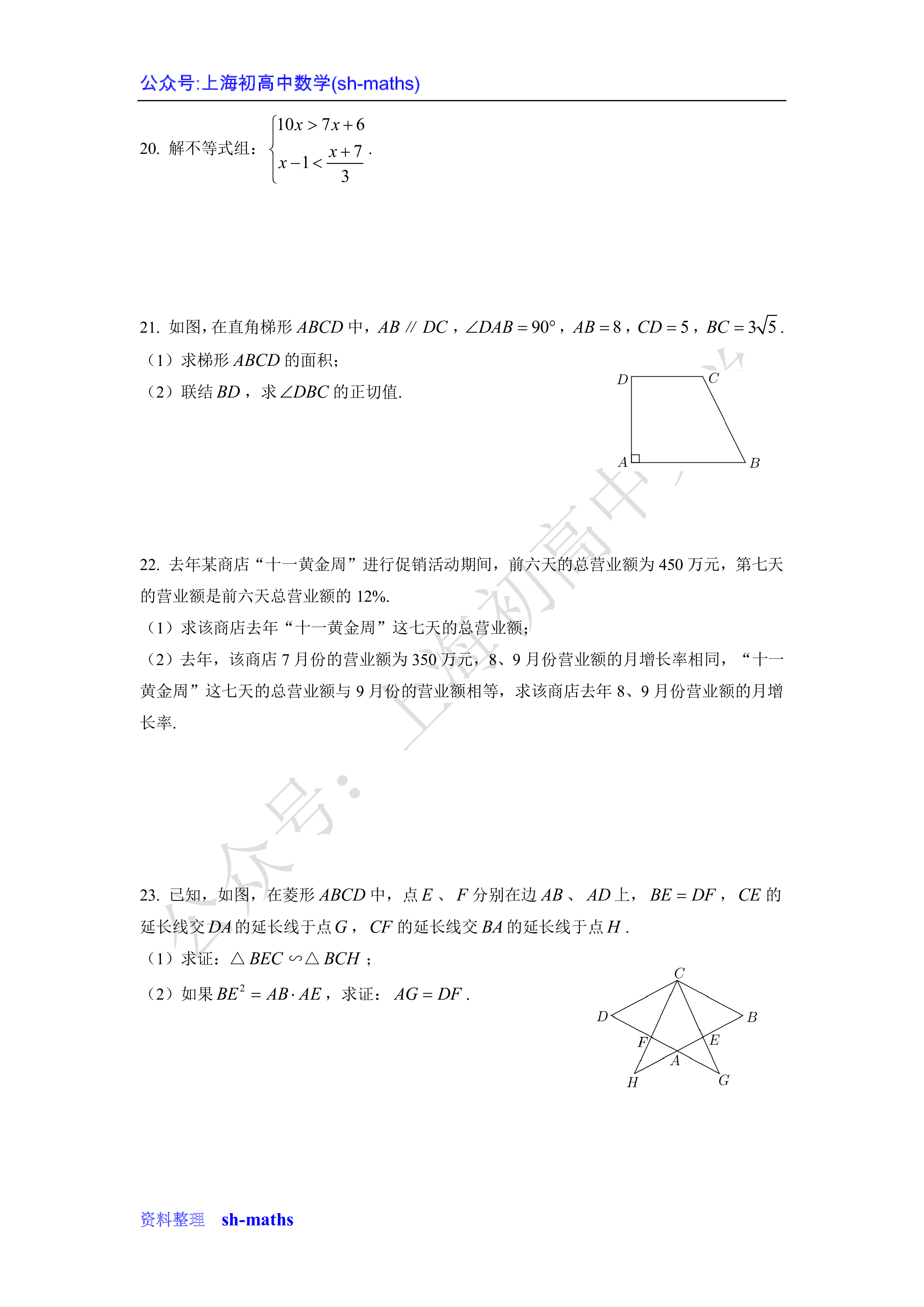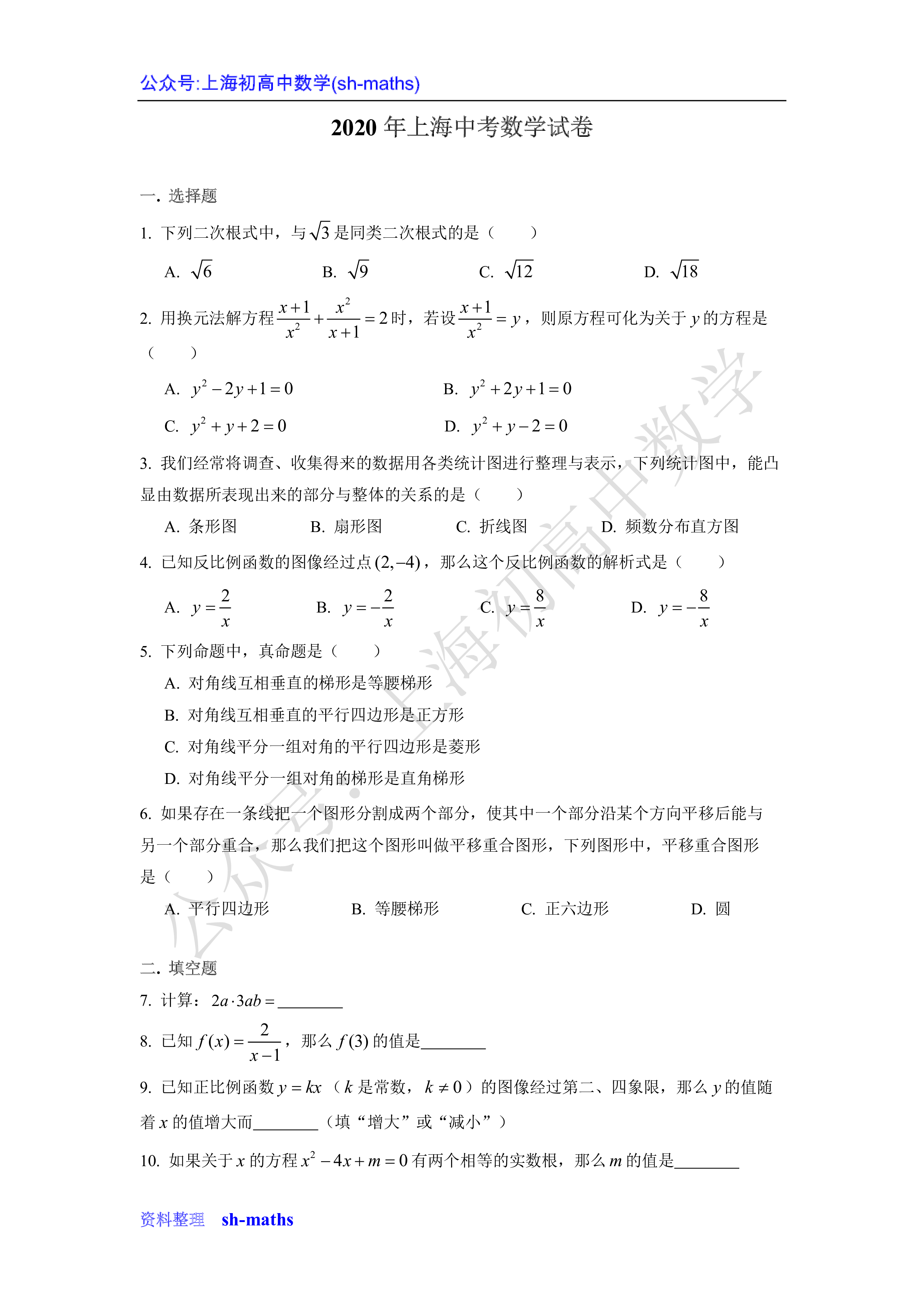 公众号:上海初高中数学(sh-maths)资料整理sh-maths2020年上海中考数学试卷一.选择题1.下列二次根式中,与3是同类二次根式的是()A.6B.9C.12D.182.用换元法解方程22121xxxx时,若设21xyx,则原方程可化为关于y的方程是()A.2210yyB.2210yyC.220yyD.220yy3.我们经常将调查、收集得来的数据用各类统计图进行整理与表示,下列统计图中,能凸显由数据所表现出来的部分与整体的关系的是()A.条形图B.扇形图C.折线图D.频数分布直方图4.已知反比例函数的图像经过点(2,4),那么这个反比例函数的解析...