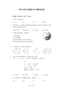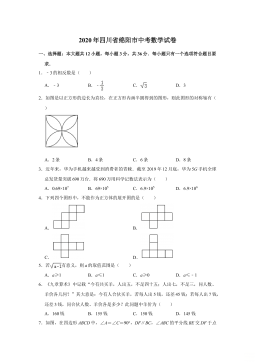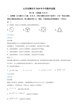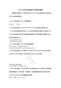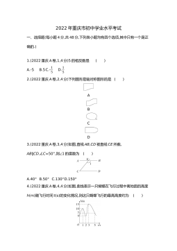 2022年重庆市初中学业水平考试一、选择题(每小题4分,共48分,下列各小题均有四个选项,其中只有一个是正确的.) 1.(2022重庆A卷,1,4分)5的相反数是( )A.-5B.5C.-15D.152.(2022重庆A卷,2,4分)下列图形是轴对称图形的是( )ABCD3.(2022重庆A卷,3,4分)如图,直线AB,CD被直线CE所截,AB∥CD,∠C=50°,则∠1的度数为( )A.40°B.50°C.130°D.150°4.(2022重庆A卷,4,4分)如图,曲线表示一只蝴蝶在飞行过程中离地面的高度h(m)随飞行时间t(s)的变化情况,则这只蝴蝶飞行的最高...